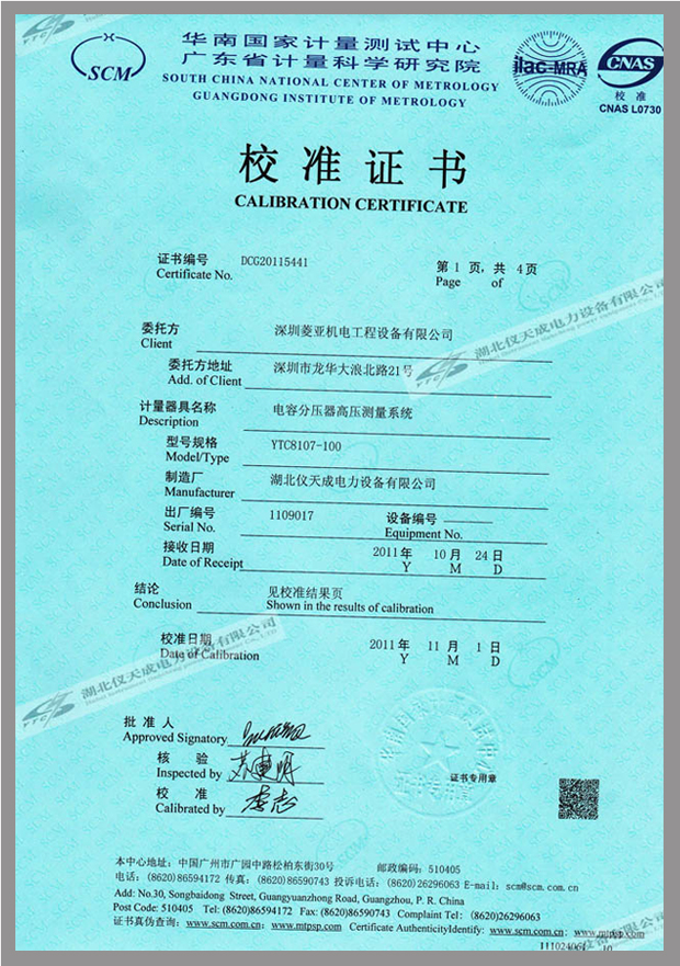轉(zhuǎn)載:"YTC8107系列電容分壓器高壓測量系統(tǒng)鑒定證書" 請注明來源于儀天成電力。 更多技術(shù)問題請致電儀天成電力客戶服務:027-87876585,技術(shù)部專線:027-87876585,在線客服:719388481